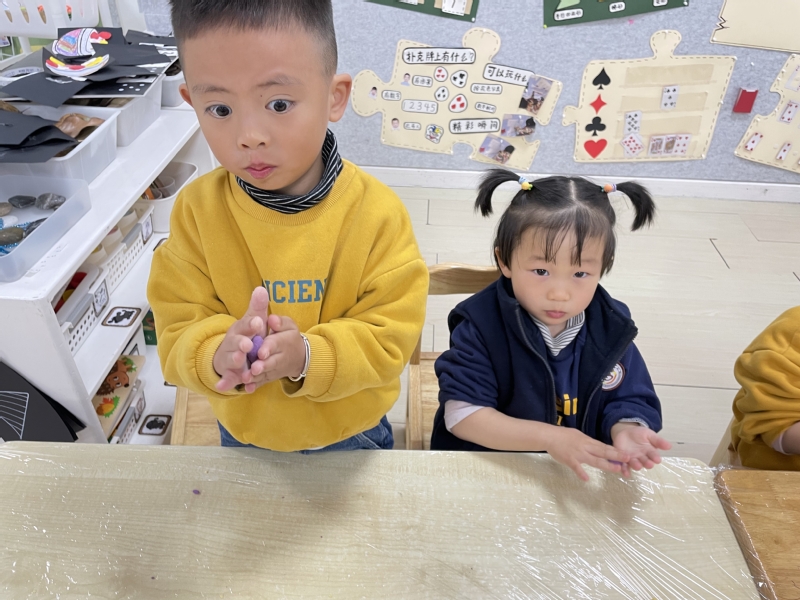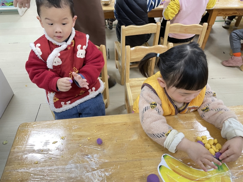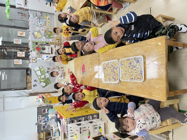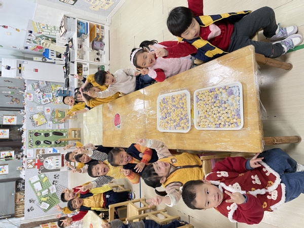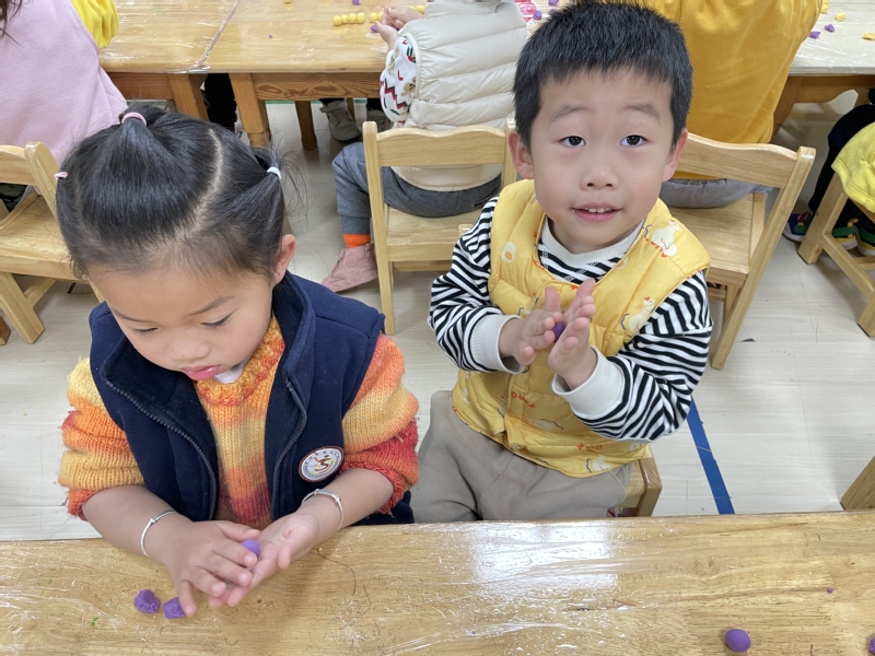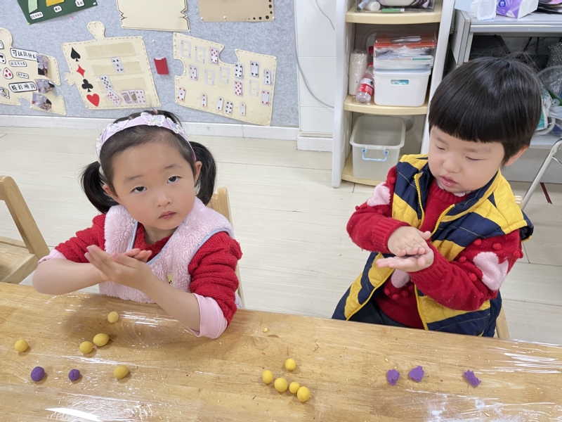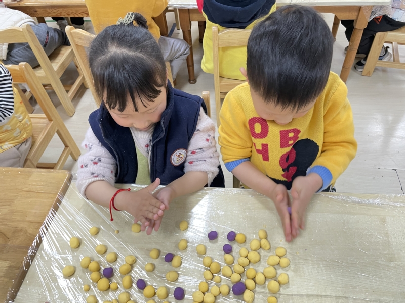 快看,我们在搓彩色元宵,黄色、紫色,多好看呀!