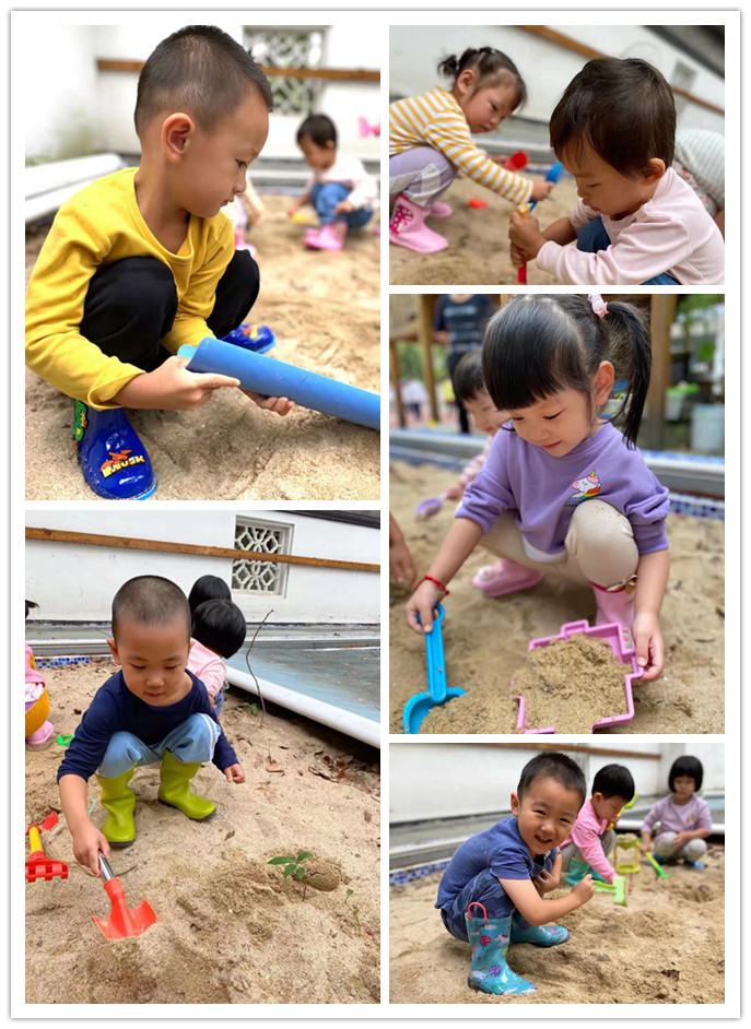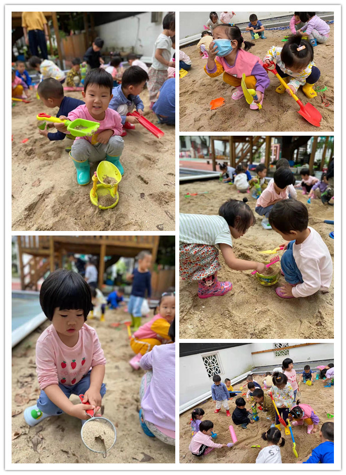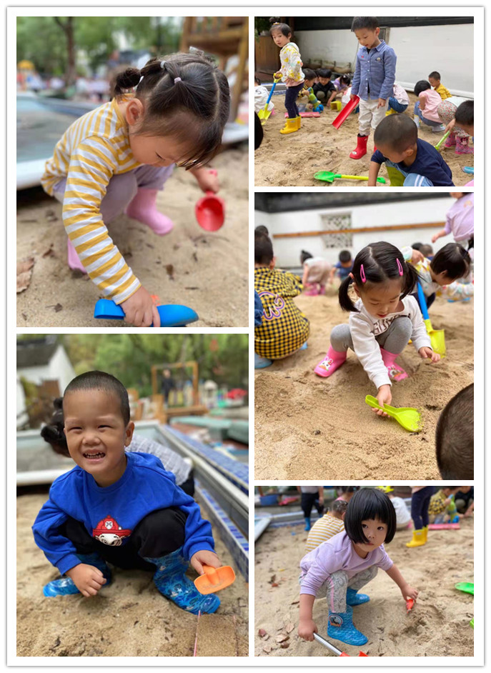 玩沙是最受孩子们喜欢的一项活动,沙子是一种不定型材料,可随意操作,而且简便易行,与其它活动相比,它更具有自主性和创造性的特点。户外活动时间,孩子们来到沙池,体验玩沙的乐趣。