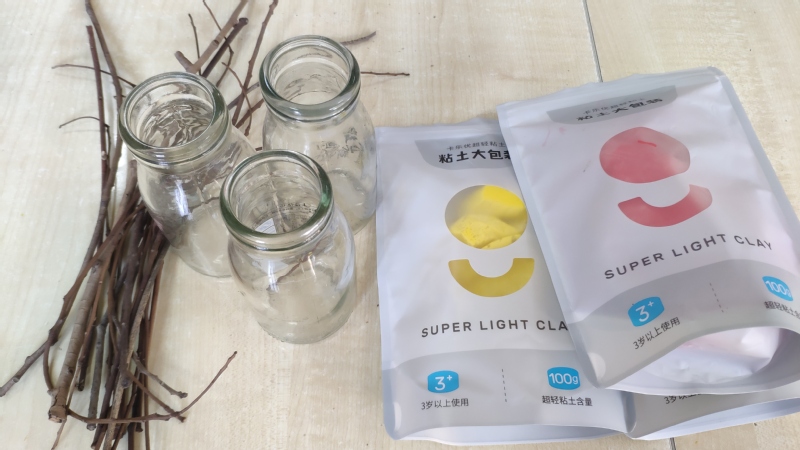 材料准备:树枝、玻璃瓶、超轻粘土。