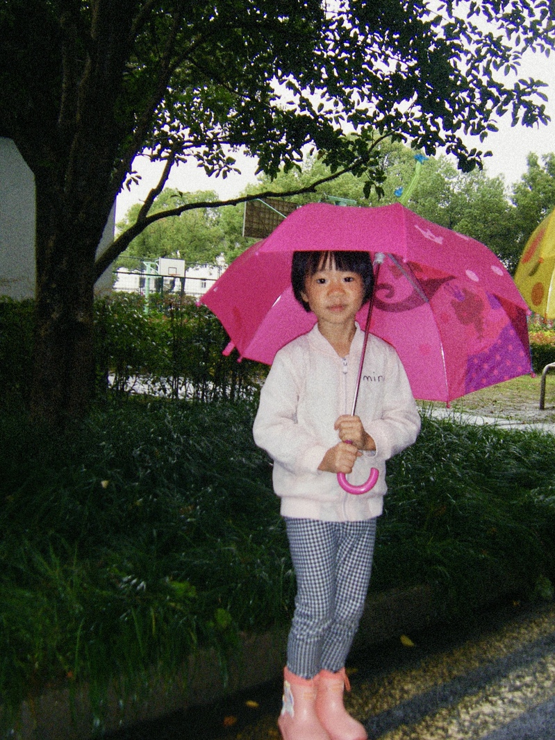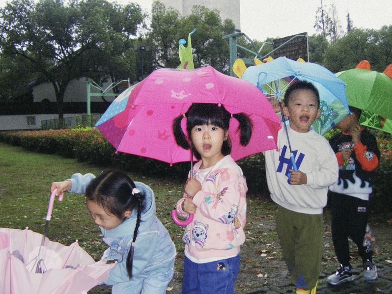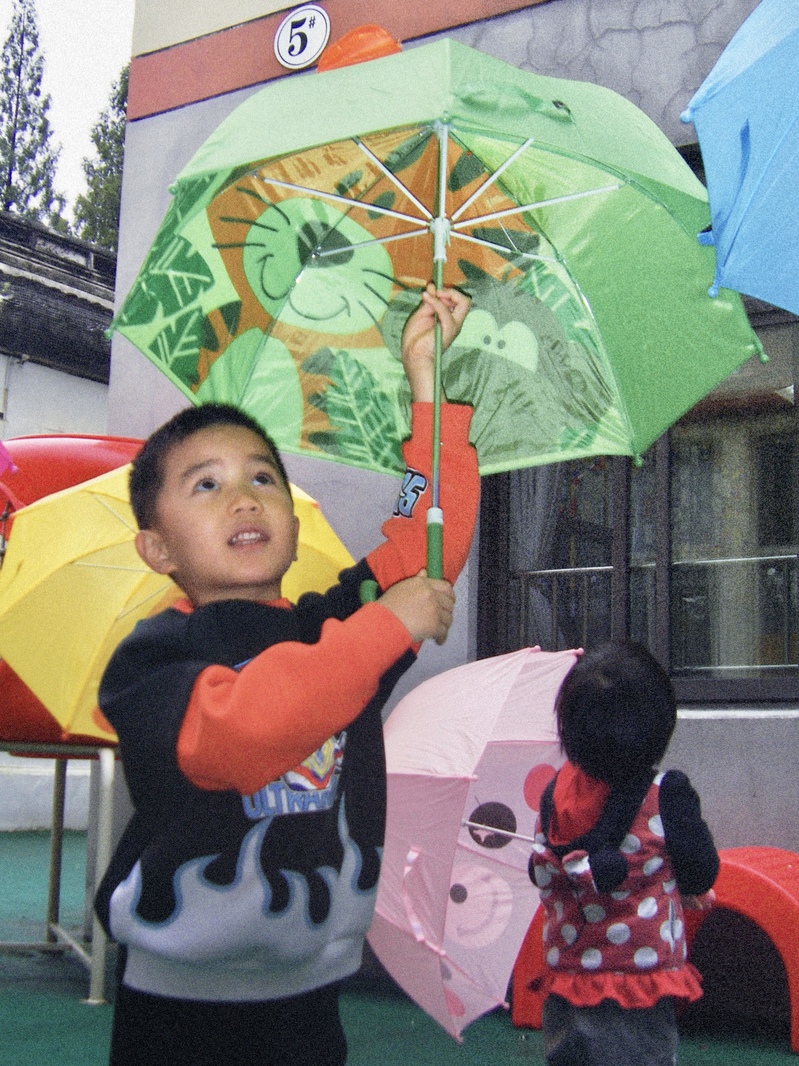 今天下雨了,撑着幼儿园新给我们买的伞去玩雨吧!