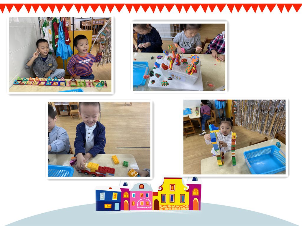 区域活动内容多,有磁力片,有彩泥、有积木等等。我们搭建了长长的火车轨道、好吃的棒棒糖、彩色小汽车、还有我家高高的房子。