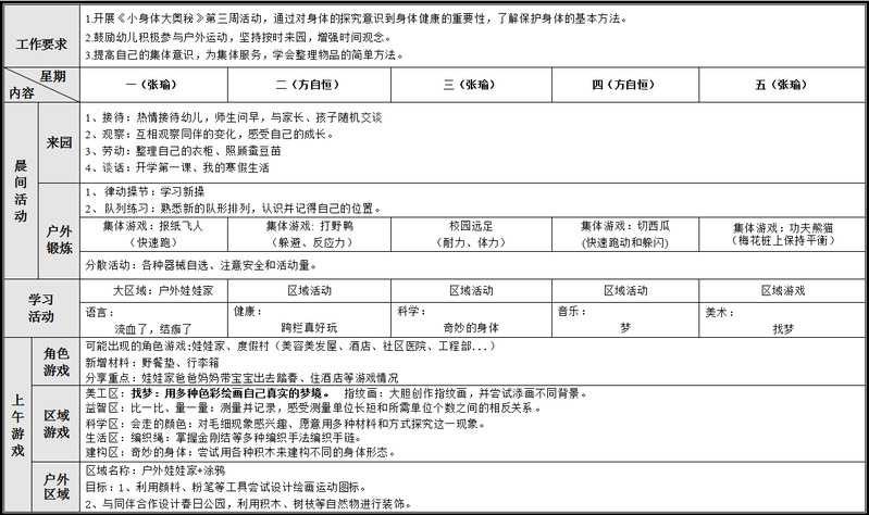 班 级:大二班 日 期:3月10日——3月14日 带班老师: 张瑜 方自恒